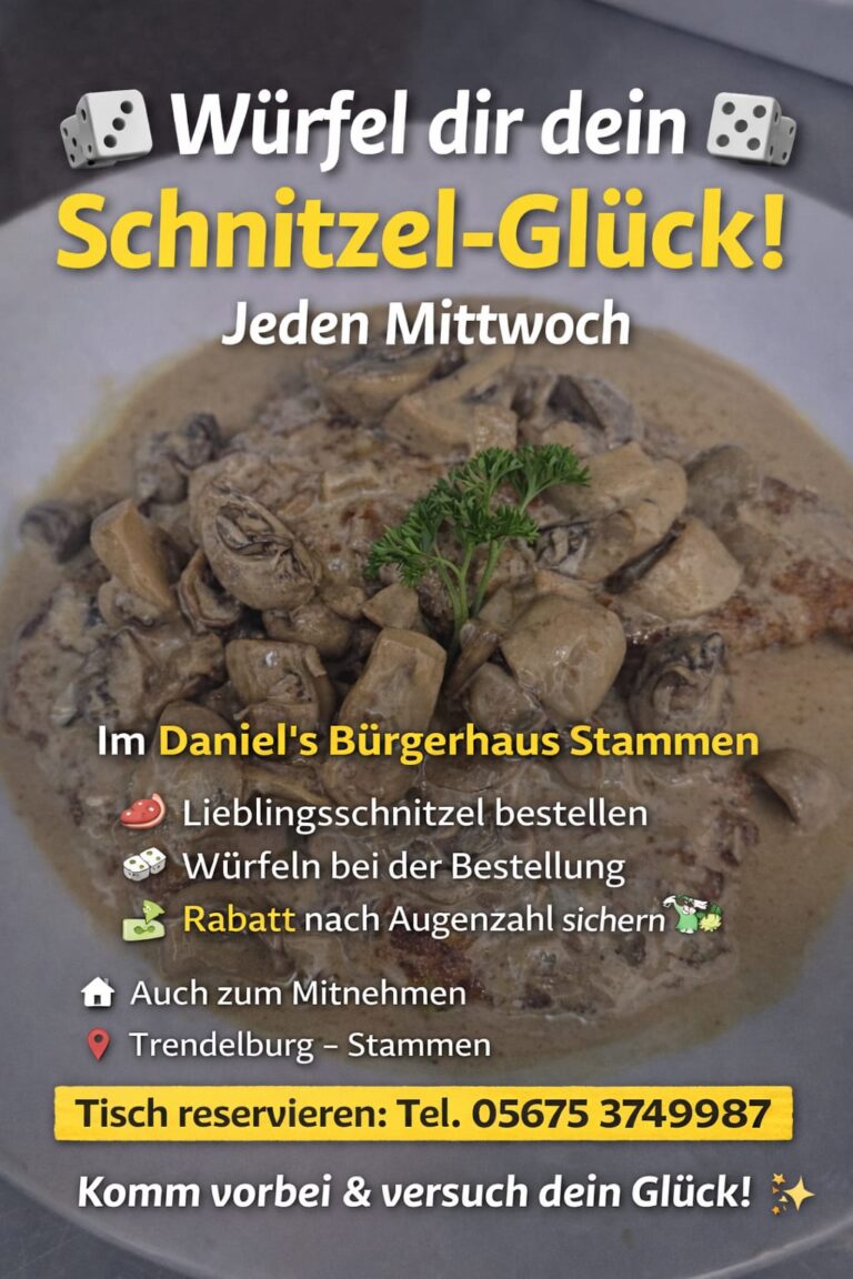 Auch abseits unserer Monatsangebote servieren wir Ihnen gern die bewährten Speisekarte. Ob Schnitzel, Burger oder ein herzhaftes Gericht wie bei Muttern – bei Daniel’s Bürgerhaus steht ehrliche, gutbürgerliche Küche und ein freundliches Miteinander im Mittelpunkt.